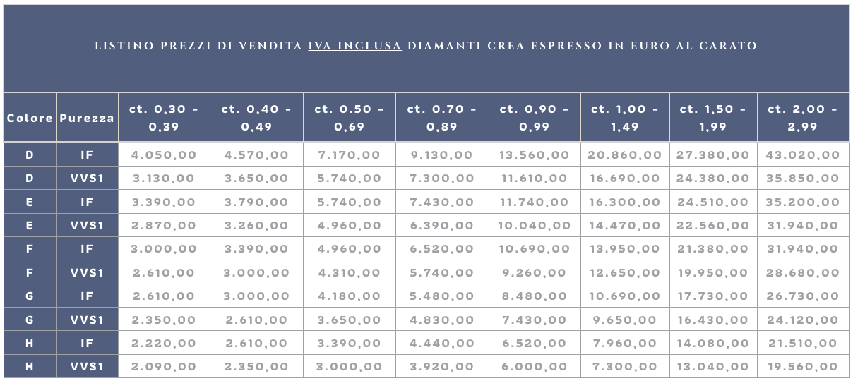 LISTINO PREZZI DI VENDITA IVA INCLUSA DIAMANTI CREA ESPRESSO IN EURO AL CARATO